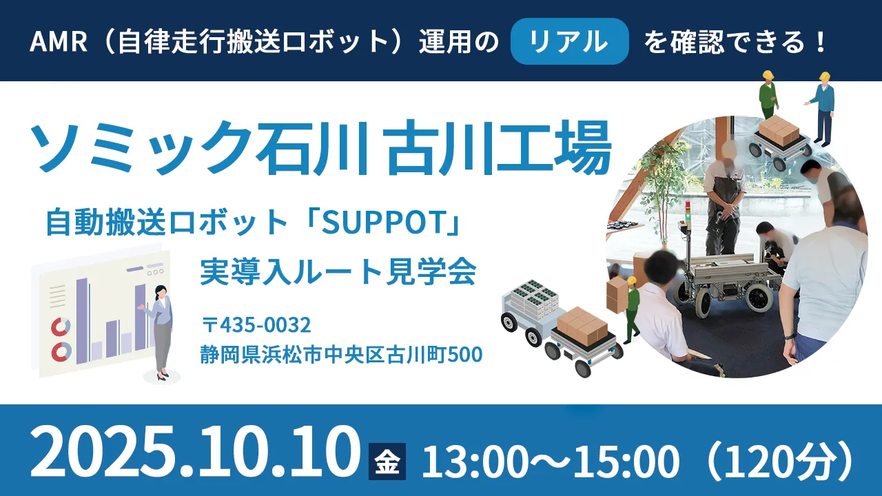 2025年9月17日(水)に開催した物流/倉庫業向けSUPPOT導入セミナーにてご案内した、ソミック石川・古川工場でのSUPPOT導入ルート見学会を、10月10日(金)13:00〜15:00に開催いたしました。ご参加いただき、誠にありがとうございました。